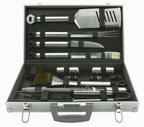 Silver Prestige 21-piece tool set with aluminum case 5 year warranty. Set includes spatula,fork,tongs basting brush, knife, 4 skewers, 8 corn skewers, grill brush with replacement head, 1 replacement