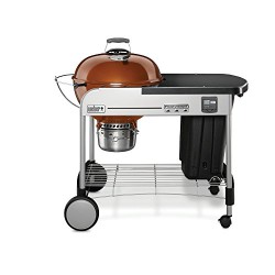 This new take on the classic Weber Performer grill has a space-saving design and exceptional maneuverability. A sturdy painted metal table is right at hand while grilling, but folds