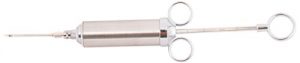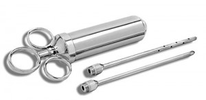 The 2-ounce Stainless Steel Marinade Injector by Masterbuilt allows you to inject herbs, butter, sauces or marinade into poultry, beef, pork or wild game. It’s easy to use; simply