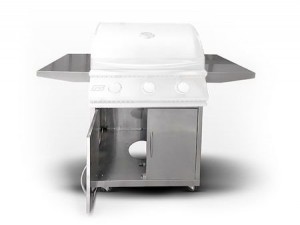 Grill not included. Two handy fold-down side shelves for easy storage. Two solid front doors. Slide-out bottle tray for LP gas. Heavy duty swivel casters. Warranty: One year. Small