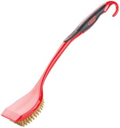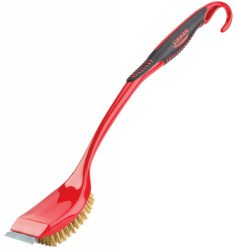 Red handled, extra-tough brass fibers, with steel scraper. Product Features BBQ brush Grooved handle with hanger hook Steel scraper 100 tufts of 3/4″ brass wire Ergonomically designed