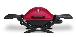 Weber Q1200 Red Gas Grill features an 8500 BTU, durable split porcelain enameled cast iron grates, 189 square inch cooking space, built-in thermometer, large grip handle and control knob