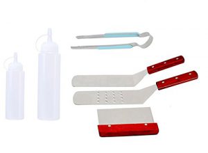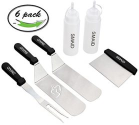 The SMAID Griddle Kit offers 2 Liquid Dispensers, 2 Professional Grade Spatulas, 1 Chopper Scrappe,1 grill forkr. Step up your backyard cooking game and add the tools needed to