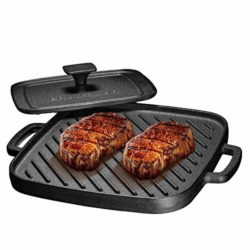 This 10″x10″ reversible grill press comes pre-seasoned, which makes them ready to cook in from the moment they arrive in your kitchen. Whether you plan on taking your cast-iron