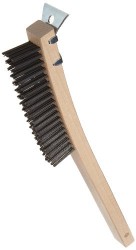 Wire brush made with 3″ x 9″ rows of tempered steel wire bristles. Sanded hardwood handle is 14″ x 1″ and has a hanging hole at one end and