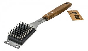 The BBQ-Aid starts with a sturdy, light brown wooden handle and extends with a a sturdy stainless steel core, leading to the brush, which has strong stainless steel bristles